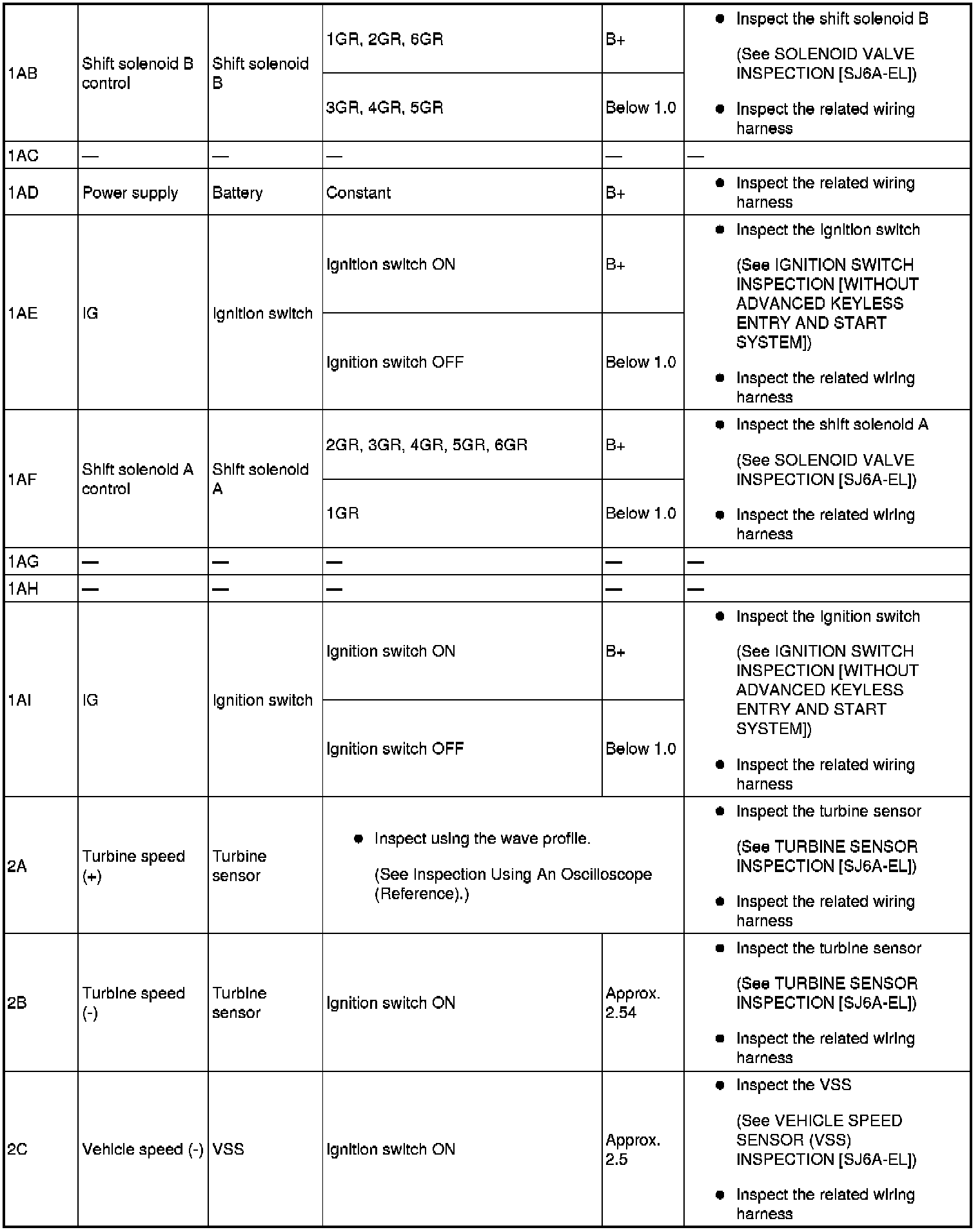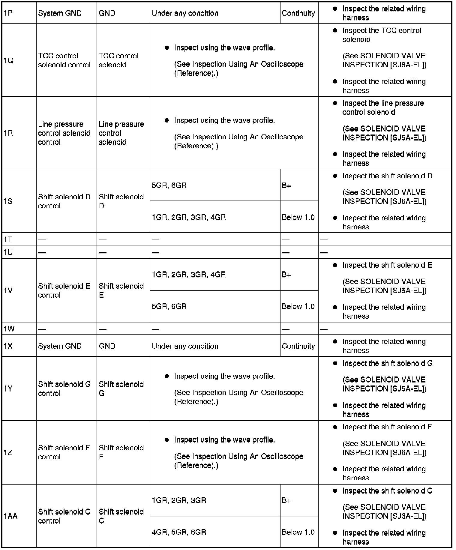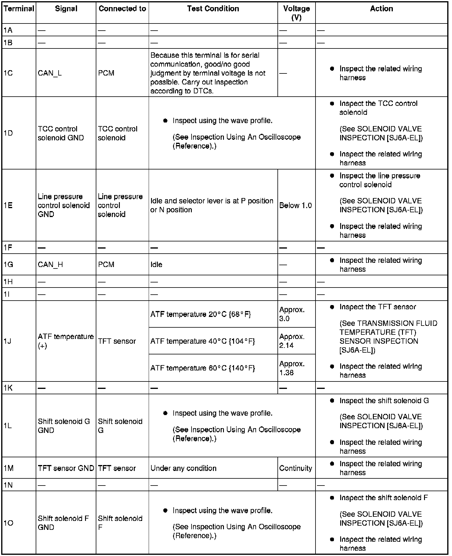 - Use the ground of terminal 1P and 1X of the TCM when measuring terminal voltage, as an error may occur when connecting the negative circuit tester to ground.
