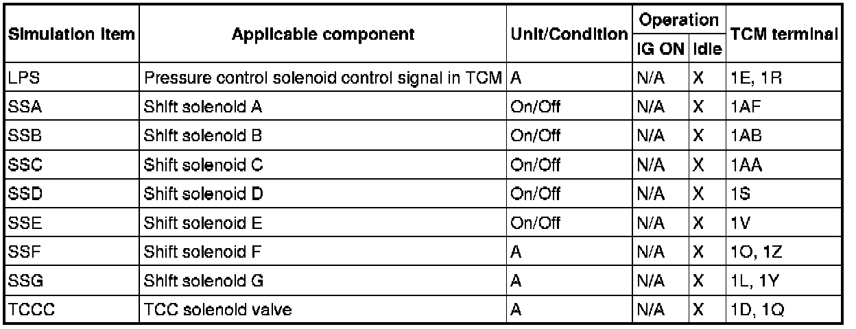 - If there is no operation sound from the solenoid after the simulation function inspection is performed, it is possible that there is an open or short circuit in the wiring harness, or solenoid, or sticking and operation malfunction.