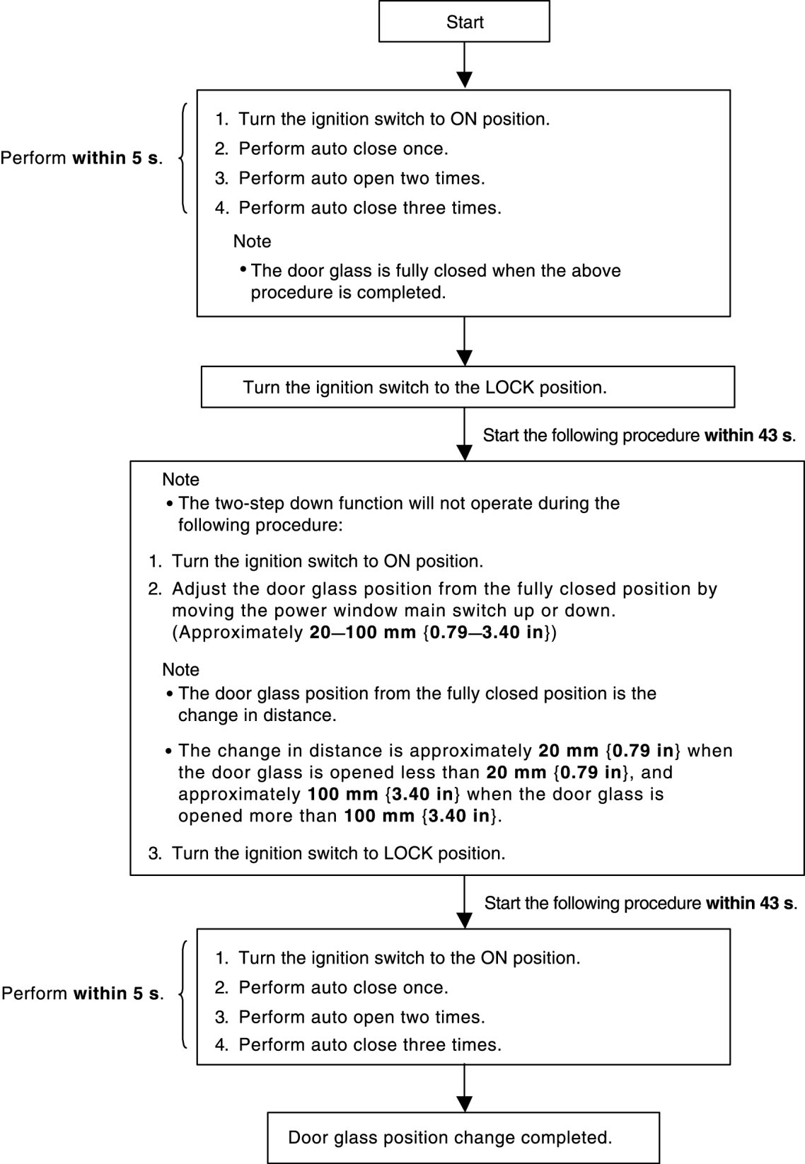 - After performing the following procedure, verify that the two-step down function operates normally and the door glass position has changed. If the two-step down function does not operate or the door glass position has not changed, the procedure was not performed properly. Repeat the procedure from the beginning.