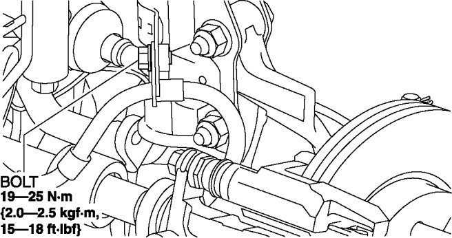 8. Install the brake hose bracket to the shock absorber, then tighten the bolt to the specified torque.