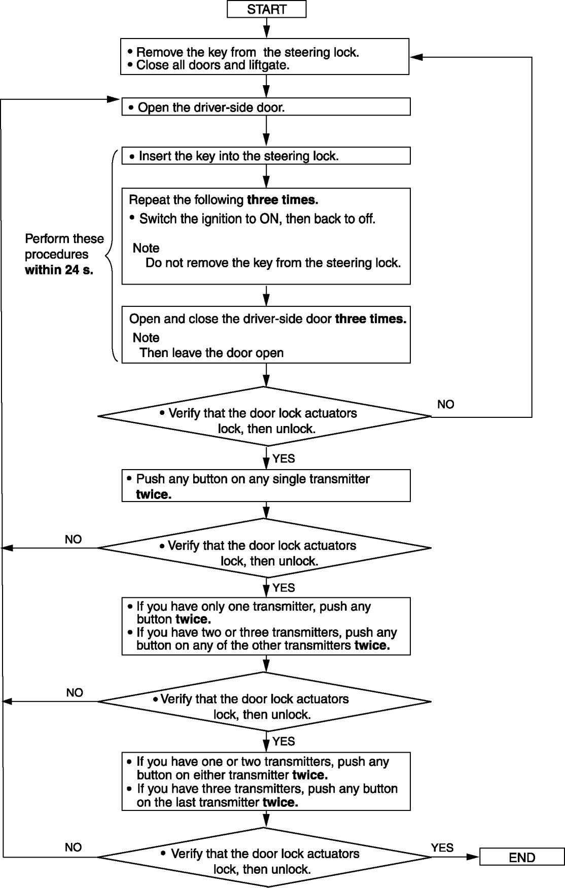 - After completing the work, remove the key from the steering lock and verify that all the door lock/unlock operation using the transmitter is correct.