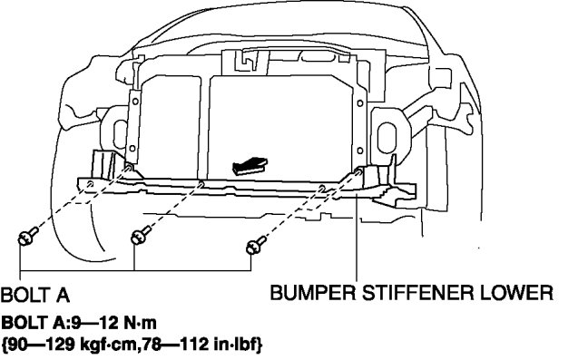 3. Remove bolts A, then remove the bumper stiffener lower in the direction of the arrow shown in the figure.