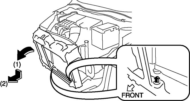 7. Pull the shroud panel in the direction of arrow (1) in the figure, and remove it in the direction of arrow (2).