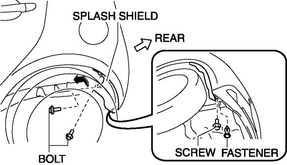 Remove the bolts, screw and fastener, then remove the splash shield in the direction of the arrow shown in the figure.
