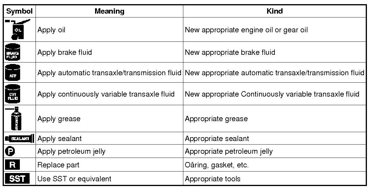 - There are nine symbols indicating oil, grease, fluids, sealant, and the use of SST or equivalent. These symbols show application points or use of these materials during service.