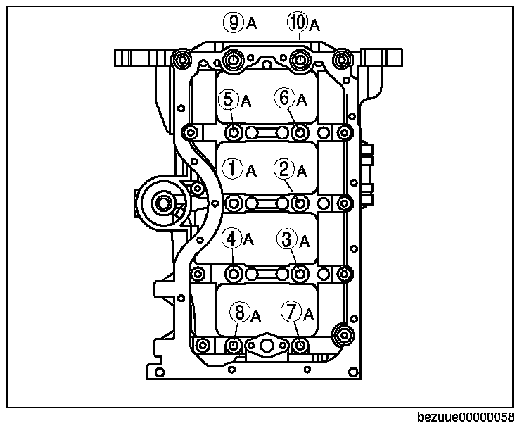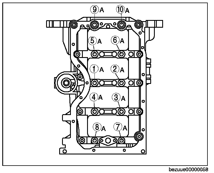 3. Tighten the lower cylinder block installation bolts A in two steps in the order shown in the figure.