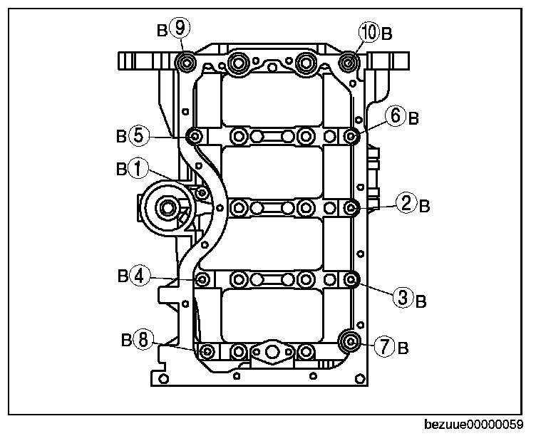4. Tighten the lower cylinder block installation bolts B in the order shown in the figure.
