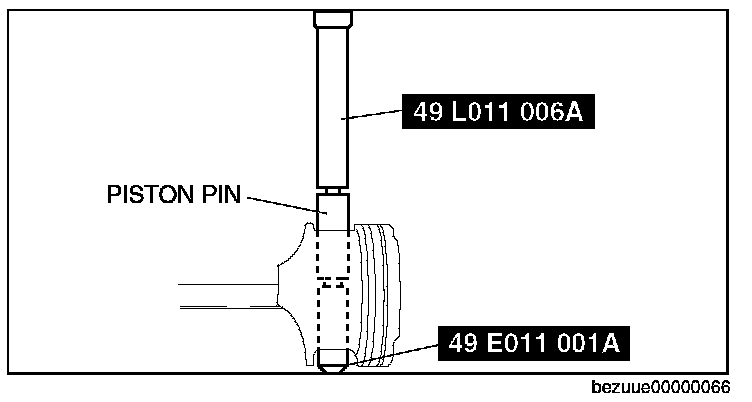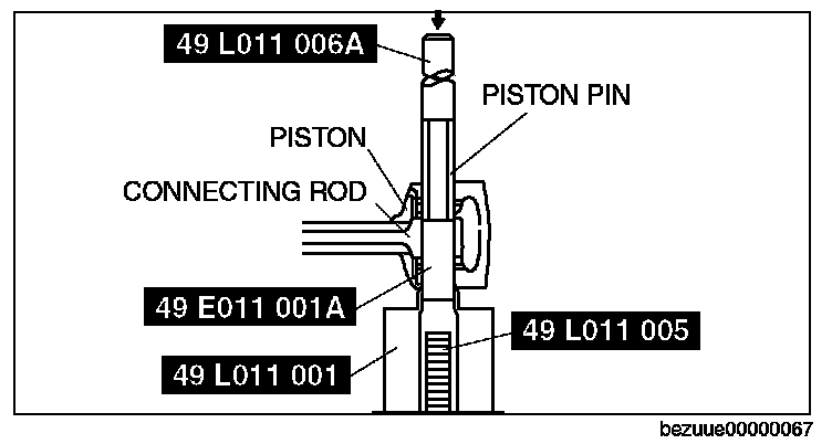 6. Press the piston pin into the piston and connecting rod until the SST (guide) contacts the SST (stopper bolt) using the hydraulic press. If it is less than the specification, replace the piston pin or the connecting rod.