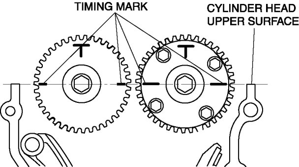 2. Align the timing marks on the camshaft sprockets so that they form a straight line in alignment with the upper horizontal surface of the cylinder head.