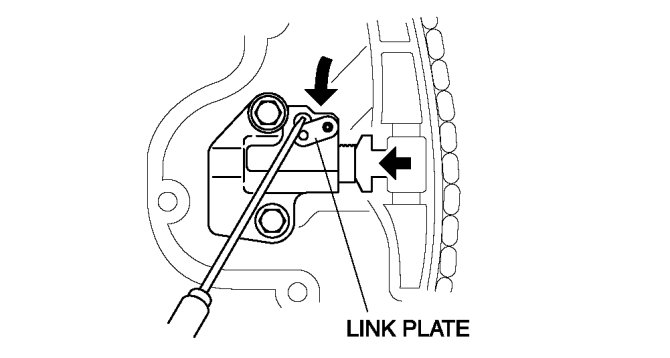 1. Push down the link plate of the timing chain tensioner using a thin flathead screwdriver (precision screwdriver), and release the plunger lock.