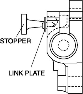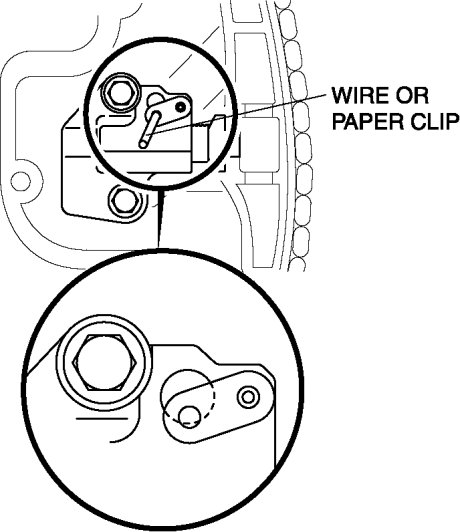 5. Insert an approx. 1.5 mm {0.06 in} wire or the paper clip where the link plate hole and the tensioner body hole overlap to fix the link plate and lock the plunger.