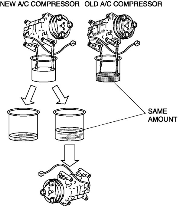 4. Adjust the quantity of the oil removed in procedure 1 to the quantity of the oil removed from the old A/C compressor, and then add it to the new A/C compressor.
