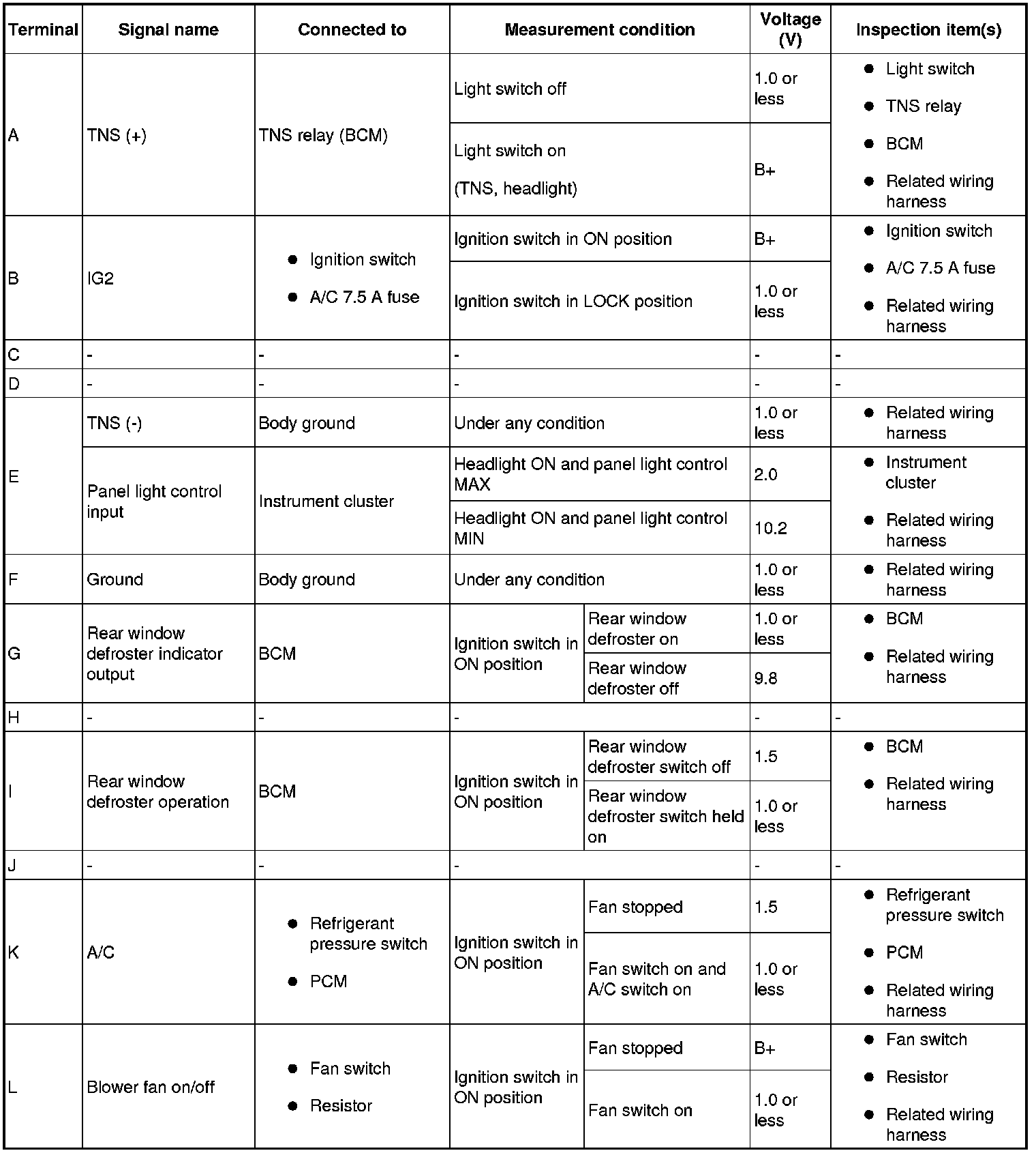 4. After inserting the positive (+) lead of the tester into the climate control unit connector, measure the voltage according to the terminal voltage table.