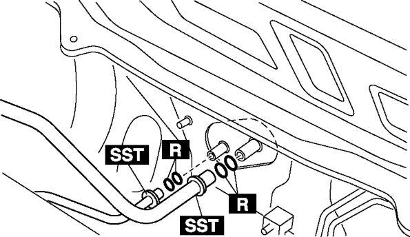 11. Using the SSTs (49 B061 014, 49 G061 001), disconnect the cooler pipe and cooler hose from the A/C unit while preventing the remaining compressor oil in the pipe and A/C unit from spilling. Service and Repair
