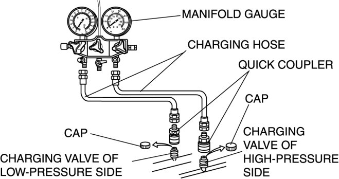 2. Connect the charging hoses to the high- and low- pressure side joints of the manifold gauge.