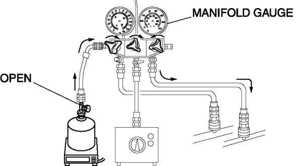 7. Open the high-pressure side valve of the manifold gauge and charge with refrigerant until the weight of refrigerant tank has decreased 250 g {8.82 oz} from the amount in Step 2.