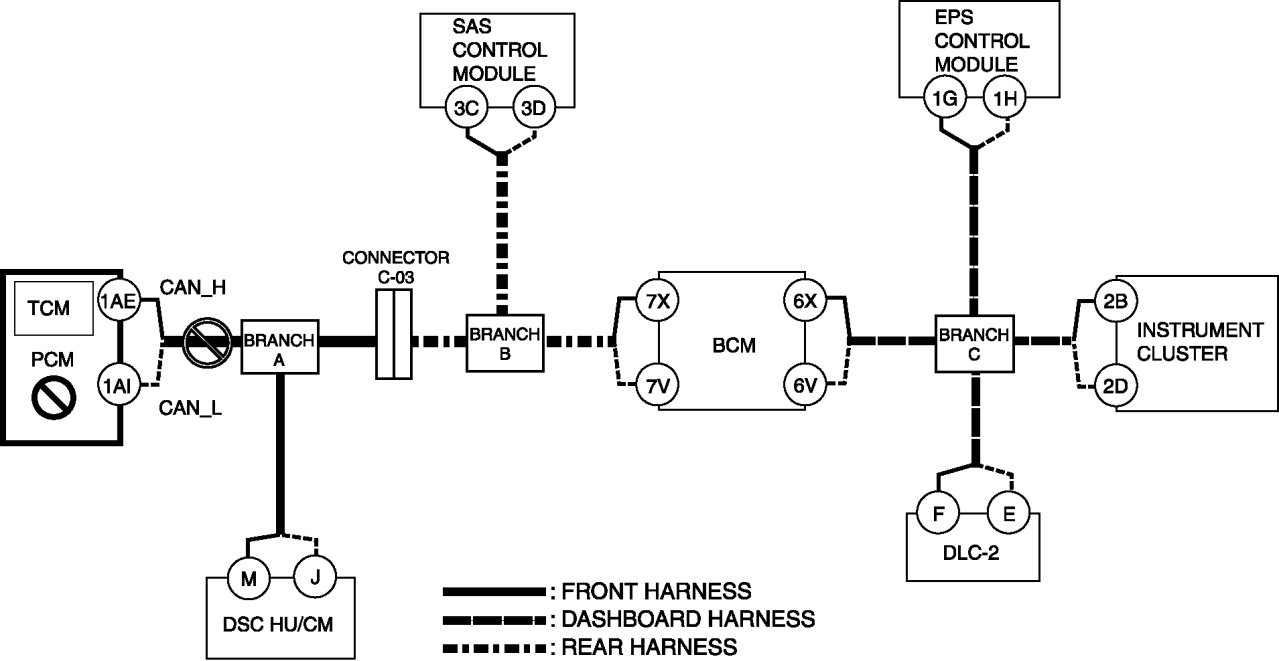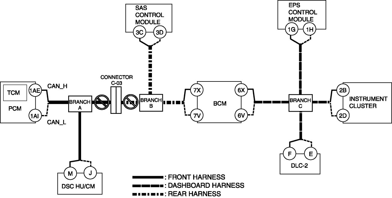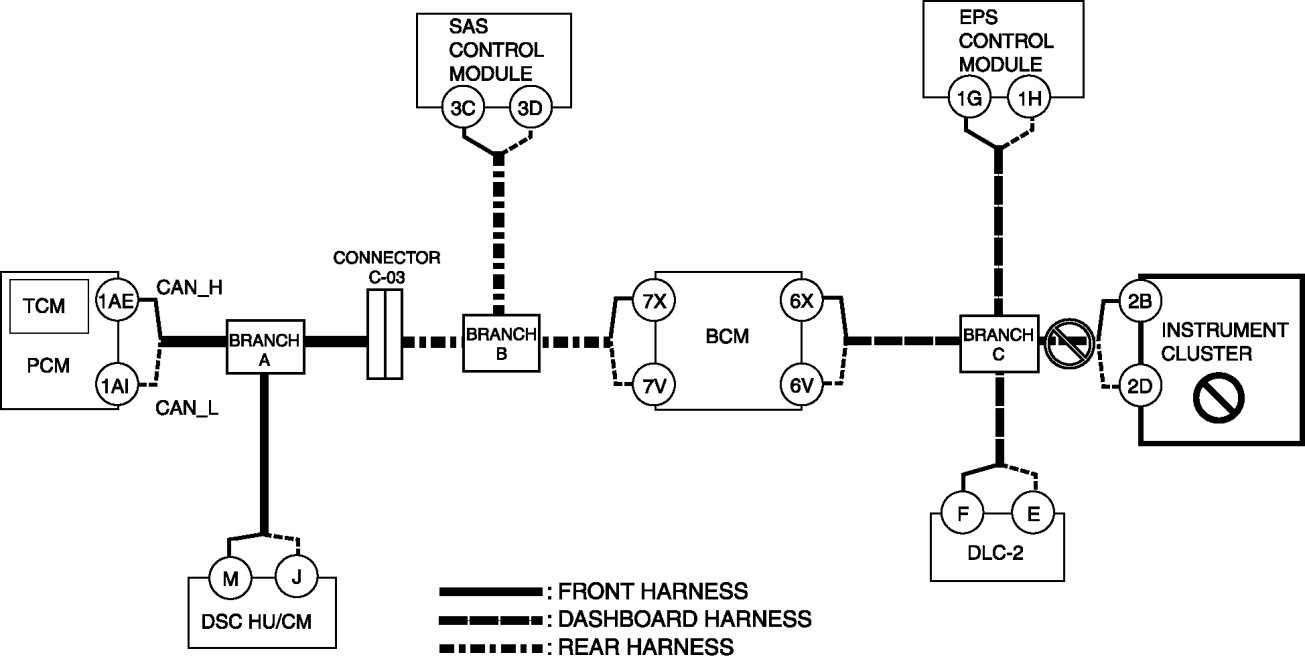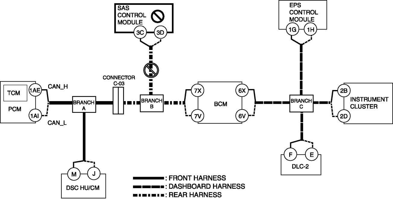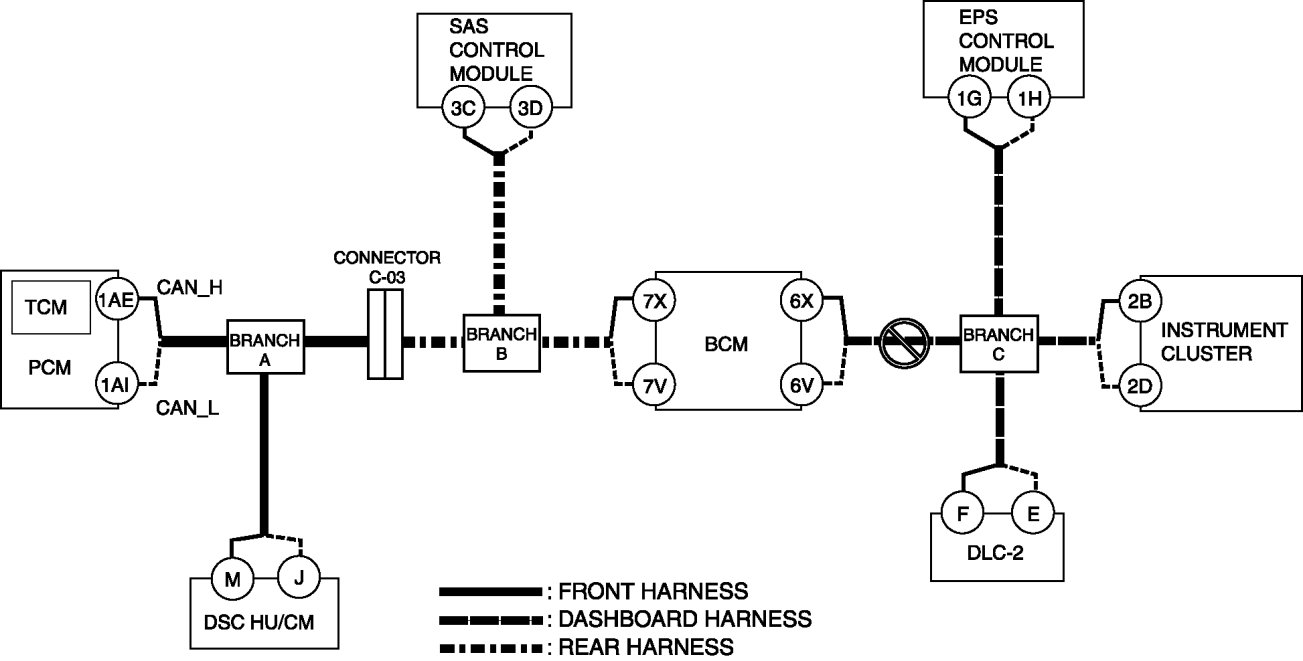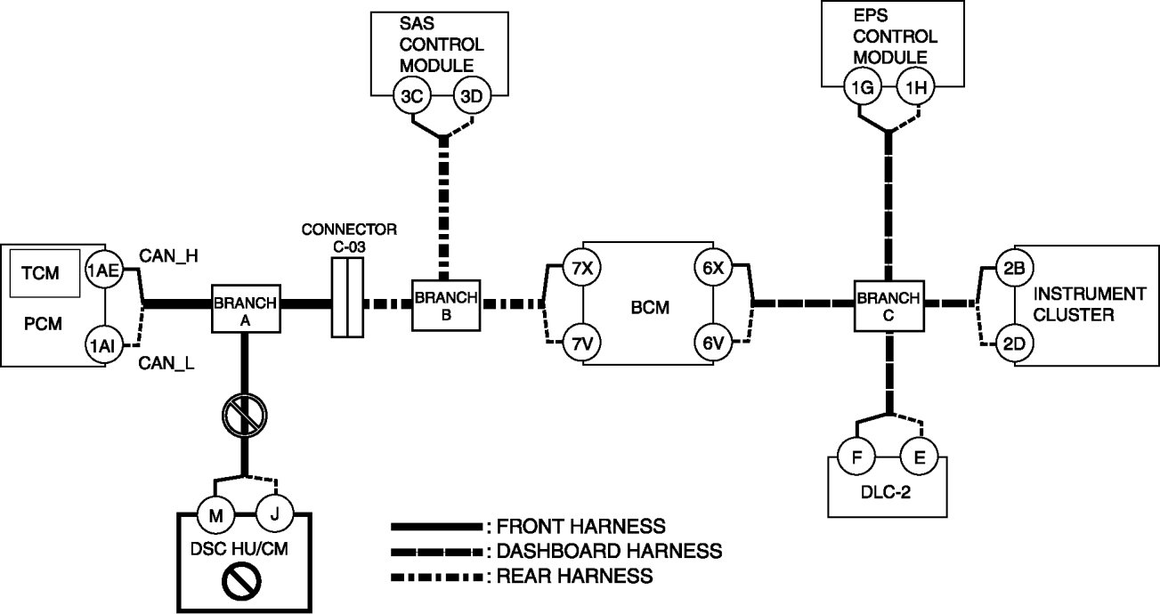 - Wiring harness between DSC HU/CM terminal J and branch A