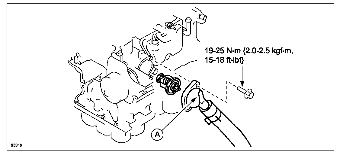 6. While pushing the thermostat cover (A) upward fully, tighten the two thermostat cover bolts.