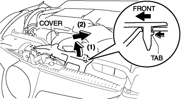 3. Press the tab in the direction of the arrow, then remove the cover in the direction of the arrow (1), (2) as shown in the figure.