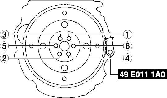 Tighten the new drive plate installation bolts uniformly in two or three steps in the order shown in the figure.