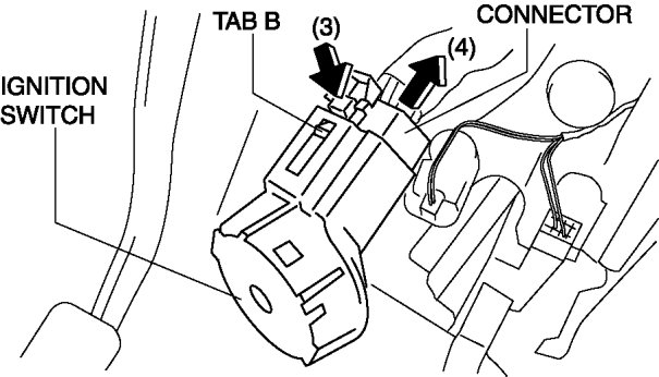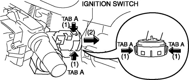 3. Press tabs A in the direction of the arrow (1) shown in the figure and pull the ignition switch in the direction of the arrow (2).
