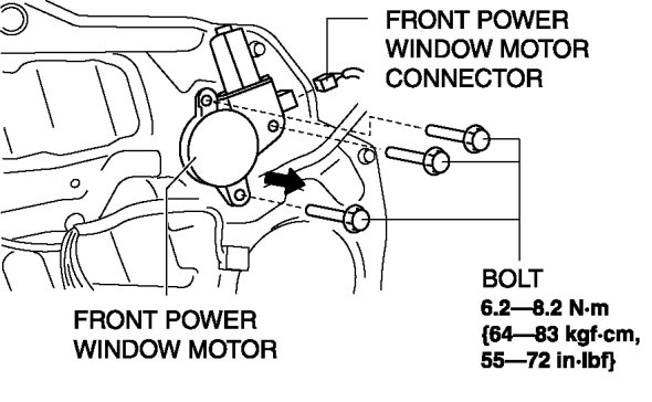 5. Disconnect the front power window motor connector, remove the bolt, then remove the front power window motor from the front power window regulator drum in the direction of the arrow shown in the figure.