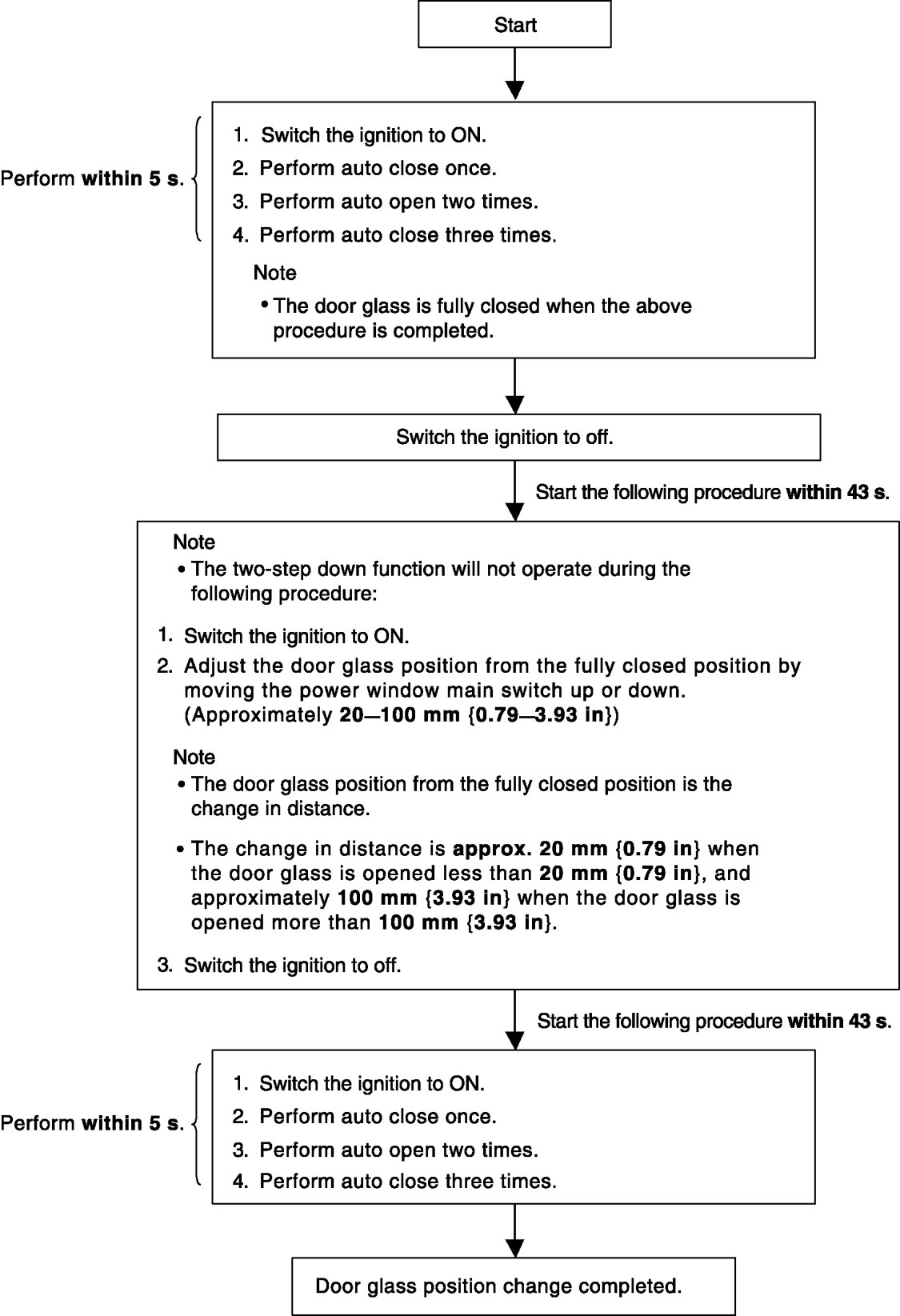 - After performing the following procedure, verify that the two-step down function operates normally and the door glass position has changed. If the two-step down function does not operate or the door glass position has not changed, the procedure was not performed properly. Repeat the procedure from the beginning.