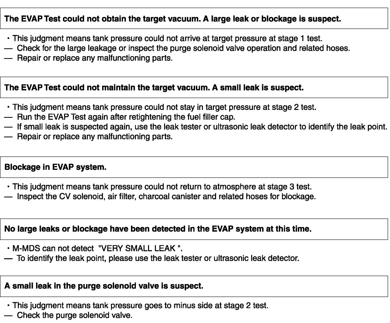 - M-MDS detects the small/large leak or blockage based on fuel tank pressure at the end of EVAP Test.
