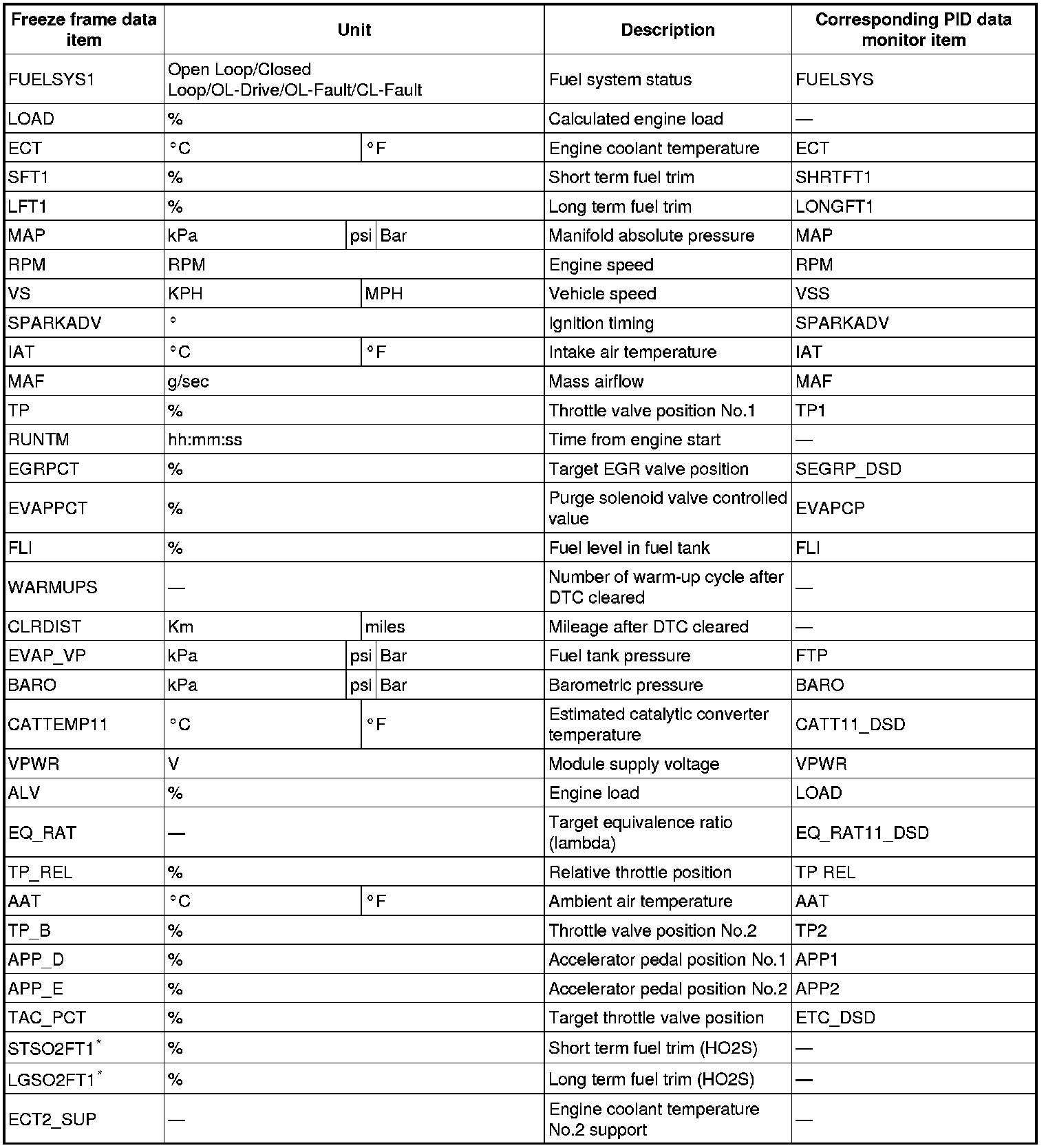 - For the freeze frame data, if there are several malfunctions in the engine control system, the data for the malfunction which occurred initially is stored. Thereafter, if a misfire or fuel injection control malfunction occurs, data from the misfire or fuel injection control malfunction is written over the initially stored data. However, if the initially stored freeze frame data is a misfire or fuel injection control malfunction, it is not overwritten.