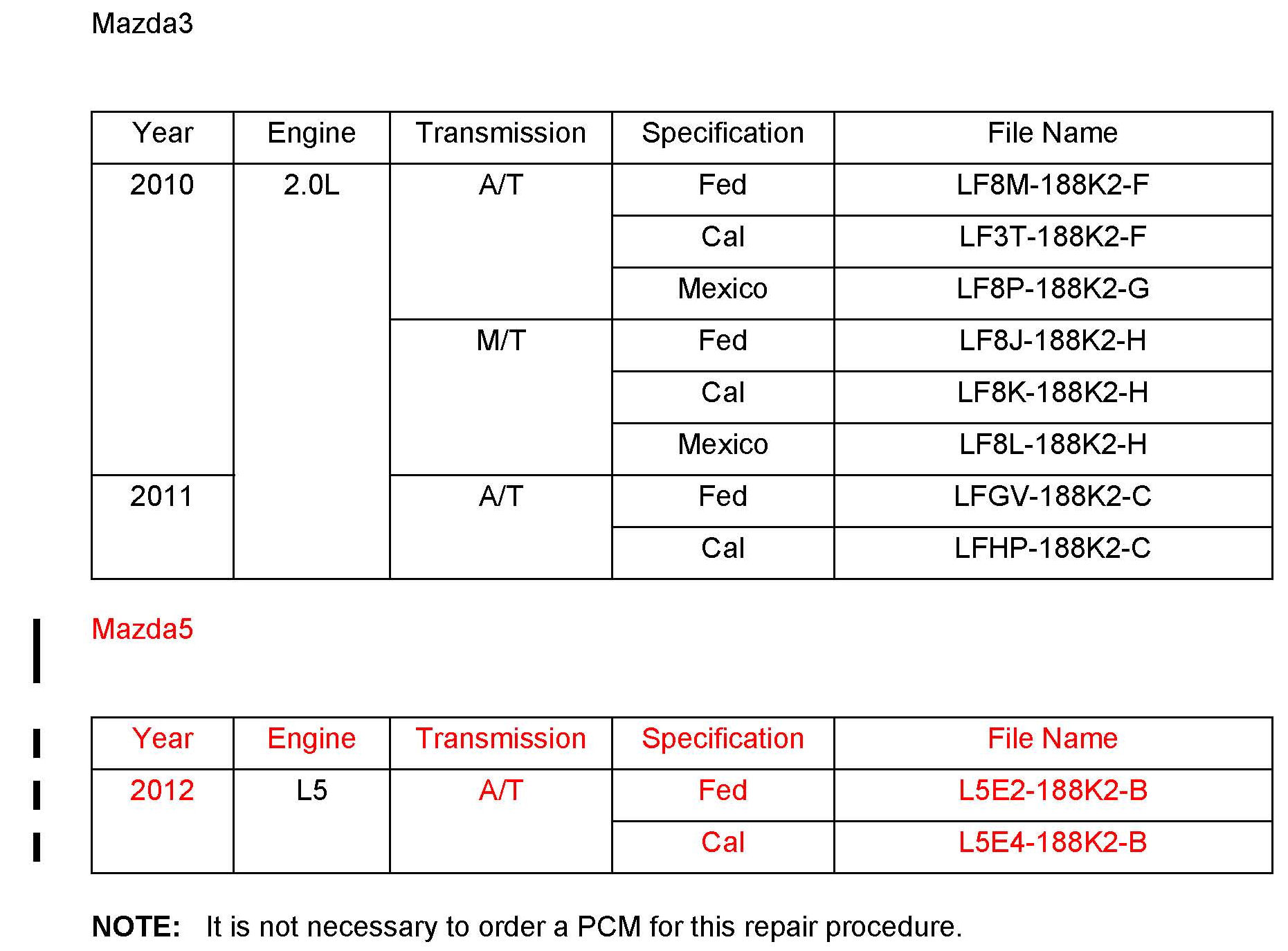 ^ Please be aware that PCM calibration part numbers and file names listed in any Service Bulletin may change due to future releases of IDS software, and additional revisions made to those calibrations for service related concerns.