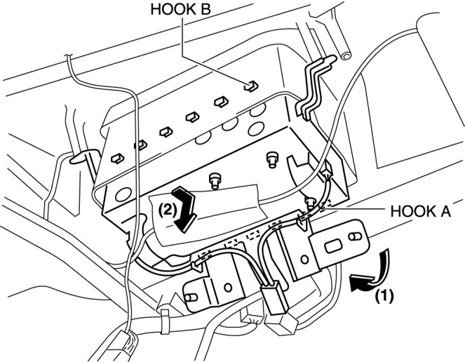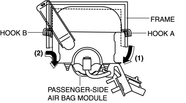 8. Pull the passenger-side air bag module in the direction of arrow (2) and detach the hook B from the instrument panel and remove it.
