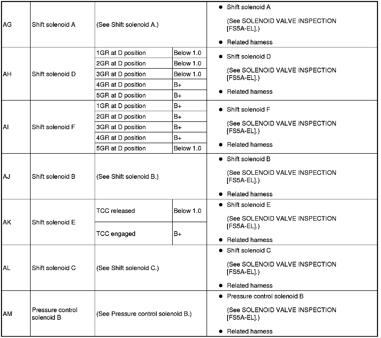 - If any incorrect voltage is detected, inspect the related system(s), wiring harnesses and connector(s) referring to the "Inspection Item" column in the "TCM Terminal Voltage".