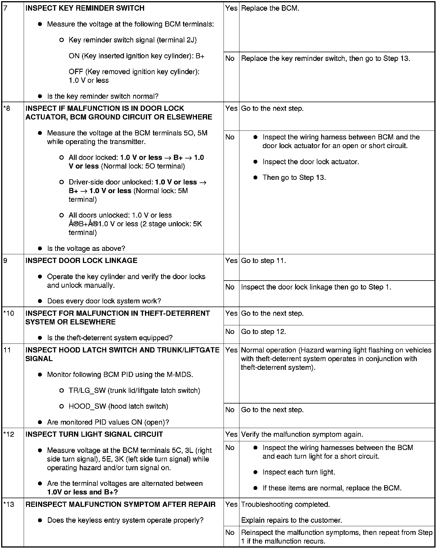 - When performing an asterisked (*) troubleshooting inspection, slightly shake the wiring harness and connectors while performing the inspection to discover whether poor contact points are the cause of any intermittent malfunctions. If there is a problem, verify that the connectors, terminals and wiring harnesses are connected correctly and undamaged.