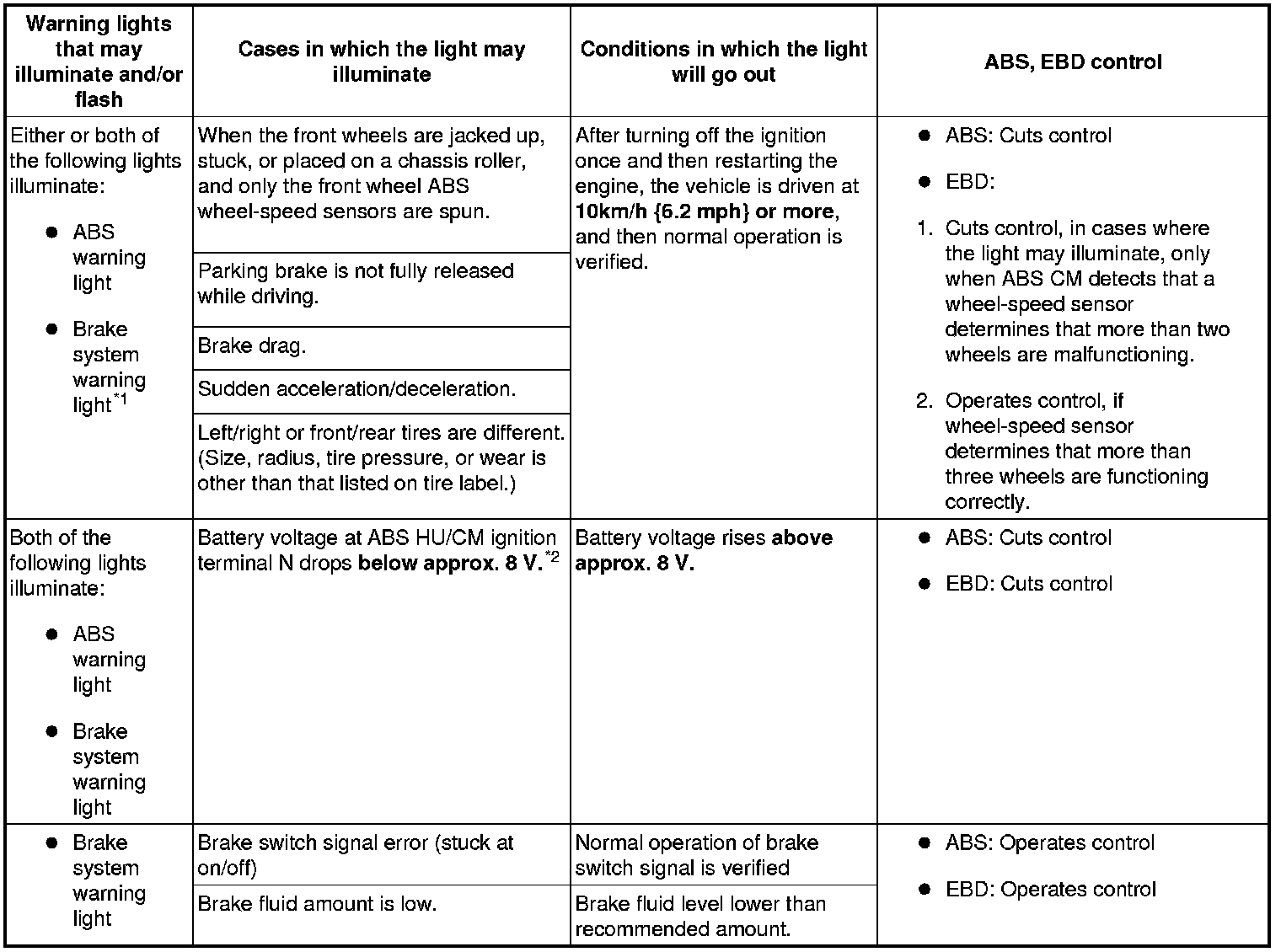 * The brake system warning light also illuminates when any two wheels malfunction, or battery voltage drops below 8 V.