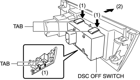 3. Remove the DSC OFF switch in the direction of the arrow (2) shown in the figure while pressing the tabs in the direction of the arrow (1).