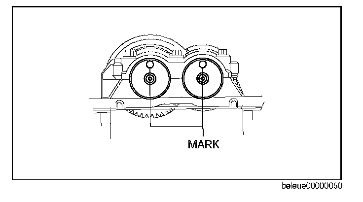 5. With the balancer unit marks at the exact top center positions, assemble the balancer unit to the cylinder block and tighten the bolts in a criss-cross pattern in two steps.