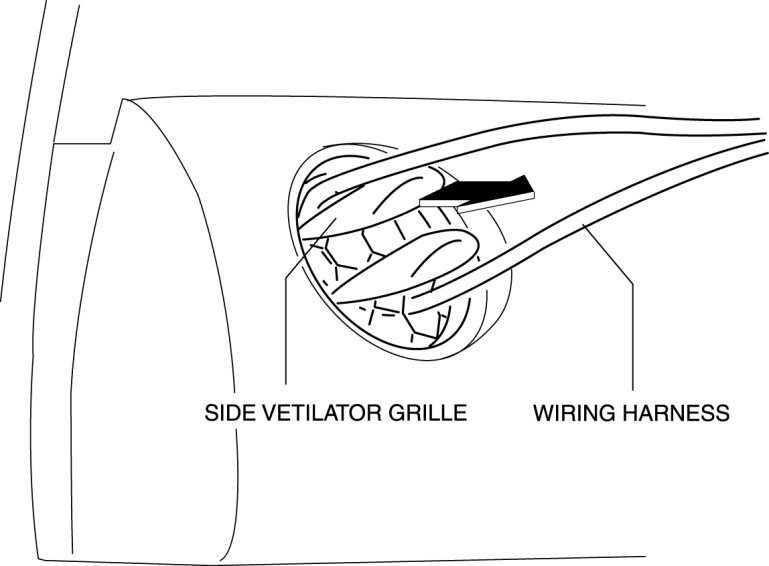 1. Through the wiring harness into the position shown in the figure, remove the side ventilator grille in the direction of arrow.