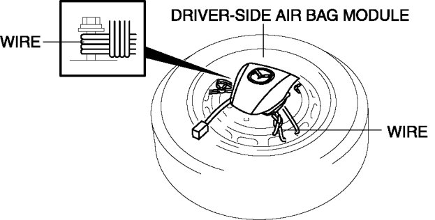 3. Place the driver-side air bag module on the center of the tire wheel with the padded surface facing up. To secure the air bag module to the tire wheel, wrap a wire (cross section 1.25 mm2 {0.002 in2} or more) through the wheel and the bolt installation holes of the air bag module at least 4 times.
