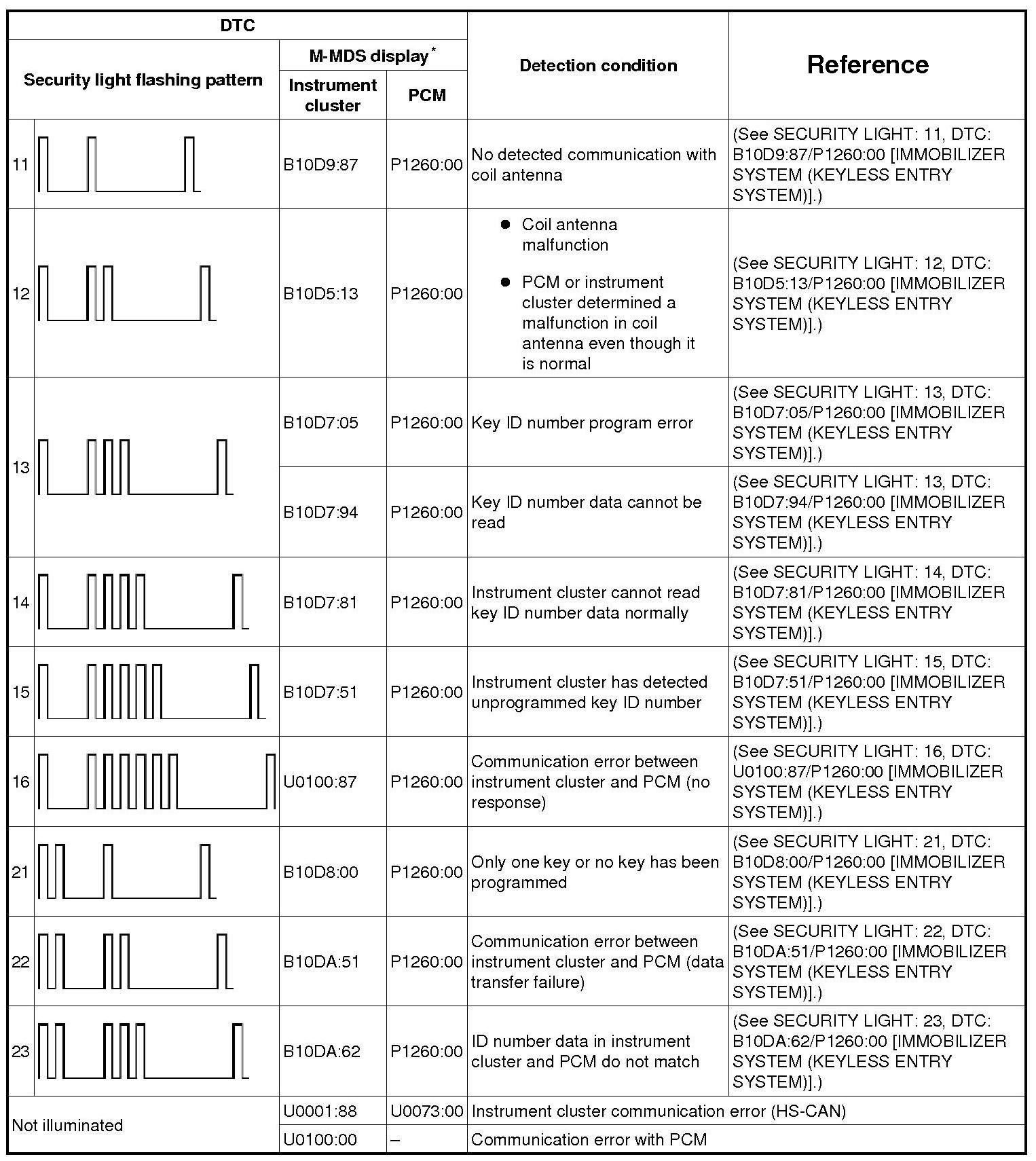- DTC 21 or higher: Illuminates for approx. 1 min and the DTC flash pattern indicated in the table below repeats 10 times.