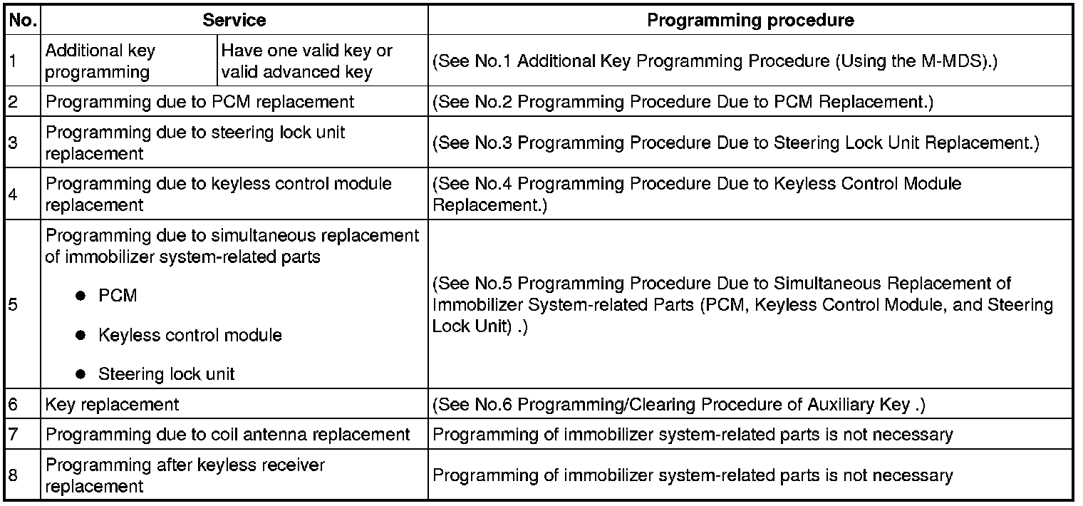 2. Select the applicable programming procedure from the service content of the immobilizer system-related parts.