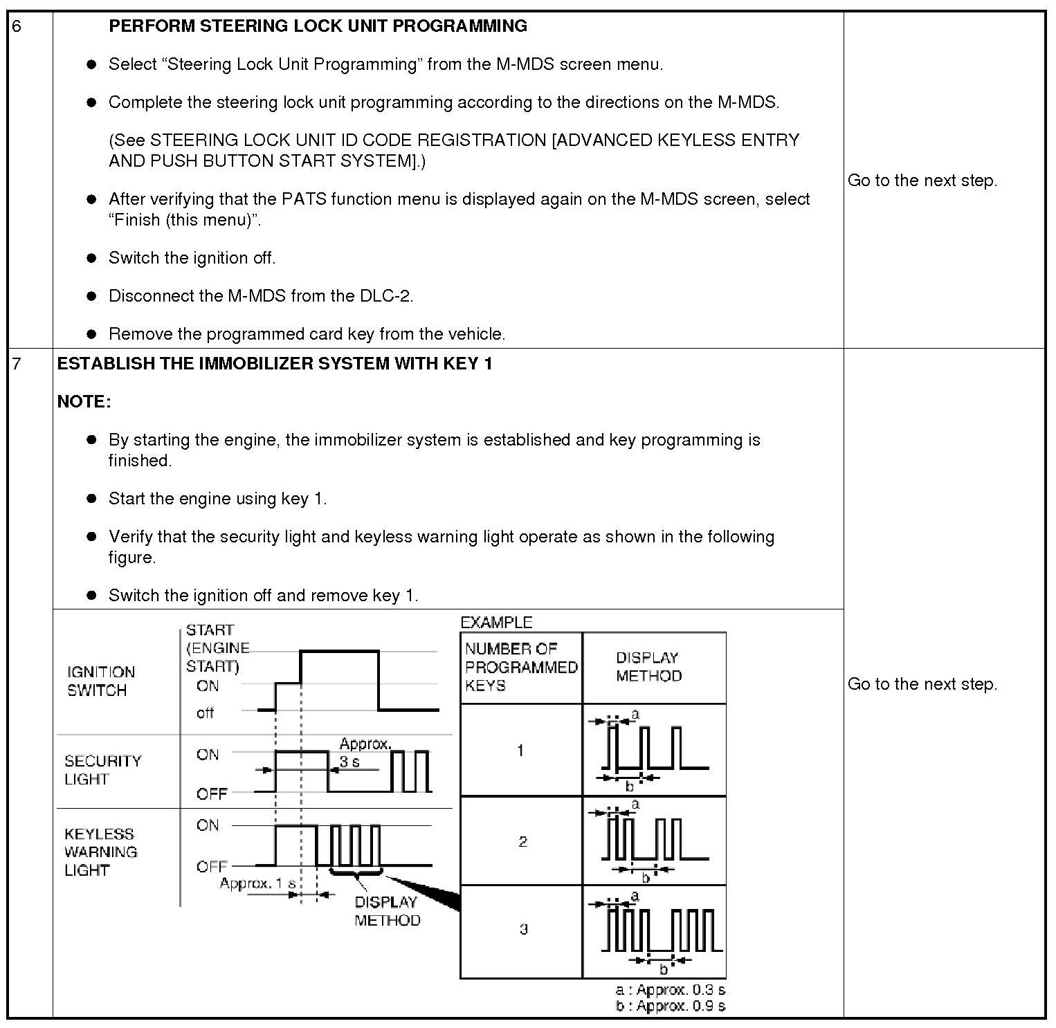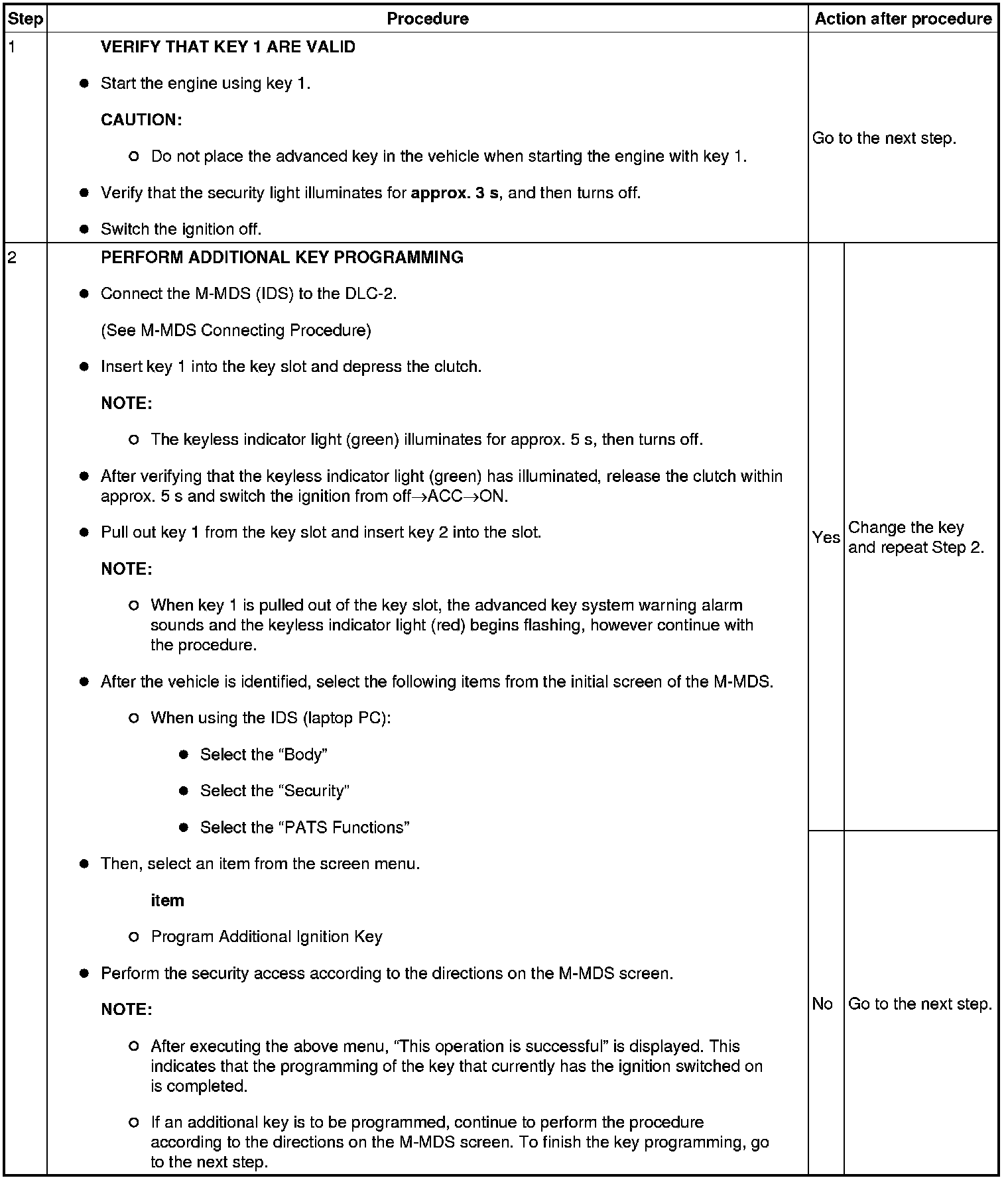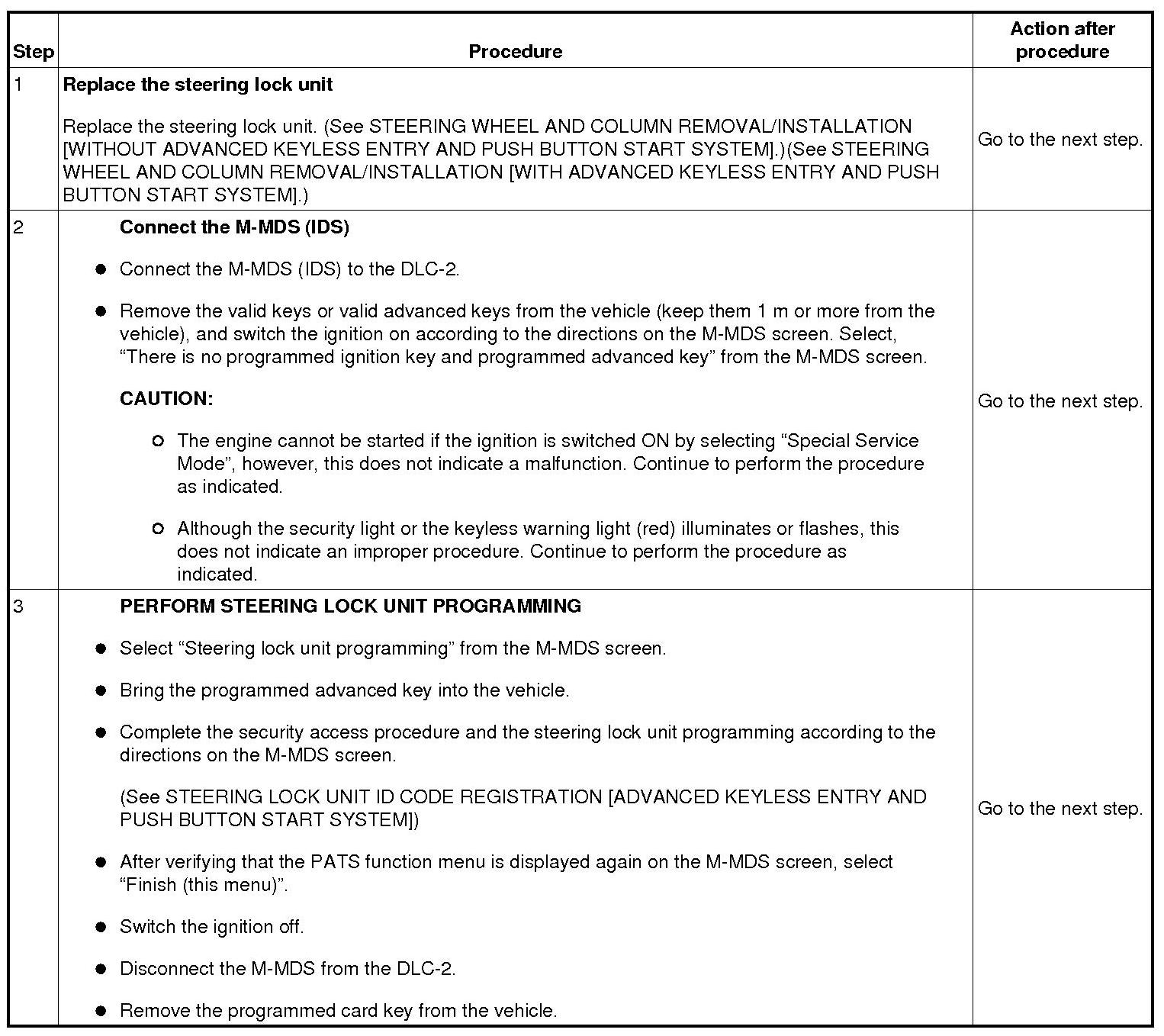 - When replacing the keyless control module or the steering lock, remove the valid keys or valid advanced keys from the vehicle (keep them 1 m or more from the vehicle) and switch the ignition on according to the directions on the M-MDS screen. Select, "There is no programmed ignition key and programmed advanced key" from the M-MDS screen.