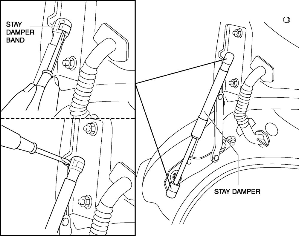 - Removing the stay damper without supporting the trunk lid can be dangerous. The trunk lid may fall and injure you. Open the trunk lid fully and support it before removing the stay damper.