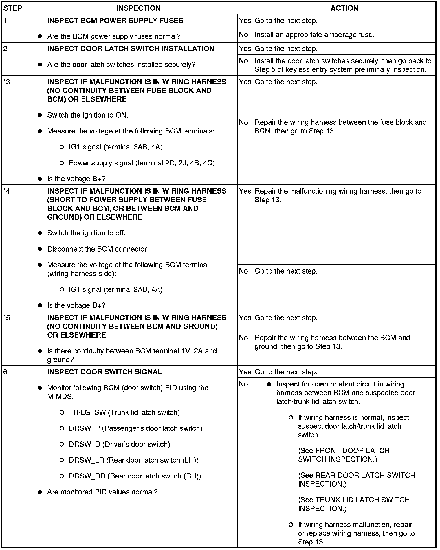 - When performing an asterisked (*) troubleshooting inspection, slightly shake the wiring harness and connectors while performing the inspection to discover whether poor contact points are the cause of any intermittent malfunctions. If there is a problem, verify that the connectors, terminals and wiring harnesses are connected correctly and undamaged.