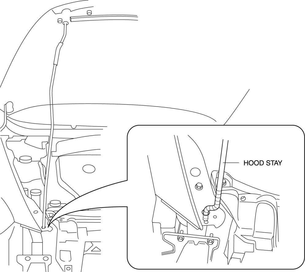 4. Remove the hood stay from the shroud panel, wrap the hood stay with protective tape, and install it to the shroud side member to support the hood.