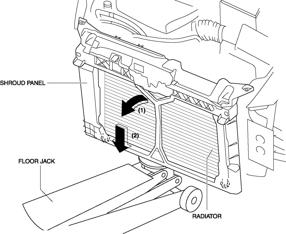 - Support the lower surface of the radiator with a floor jack to prevent the radiator from falling off after the shroud panel is removed.