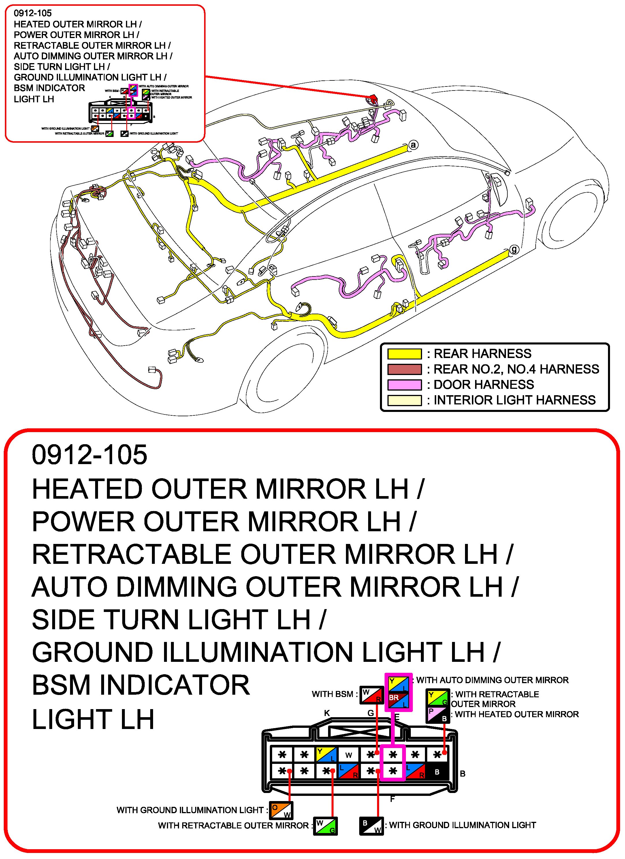 Heated Outer Mirror LH/Power Outer Mirror LH/Retractable Outer Mirror LH/Auto Dimming Outer Mirror LH/Side Turn Light LH/Ground Illumination Light LH/BSM Indicator Light LH