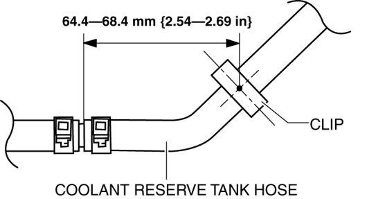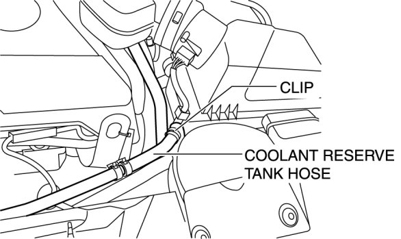 - If the coolant reserve tank hose is installed to the clips at the wrong locations, the hose may contact other parts and be damaged. When reinstalling the coolant reserve tank hose to the clips, install it to the original locations according to the following procedure.