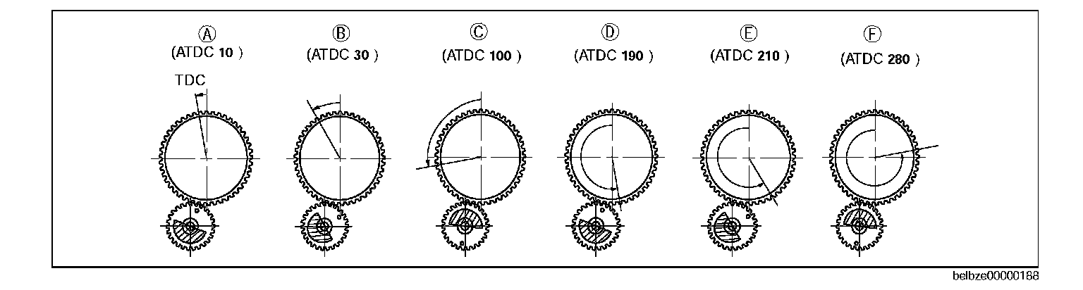 1) Place the ATDC marks 10°, 30°, 100°, 190°, 210°, 280° on the rear side of the crankshaft to indicate the angles.