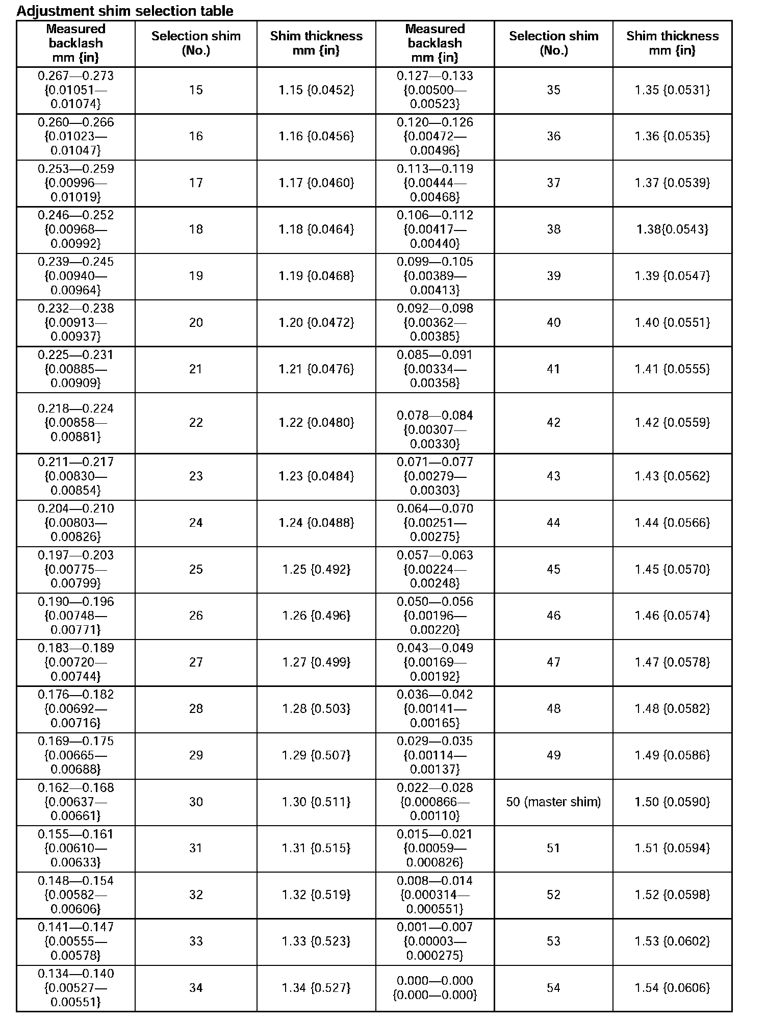 8. Select the adjustment shim from the selection table based on the measured minimum value of the backlash.