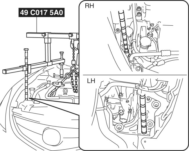 a. As shown in the figure, set the rear shafts of the SST to the left and right shock absorber bolts.